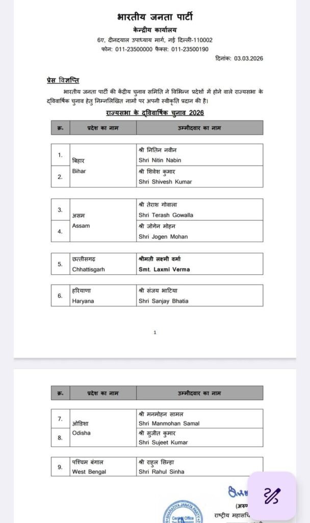 भारतीय जनता पार्टी (बीजेपी) ने आगामी राज्यसभा चुनाव के लिए लक्ष्मी वर्मा को अपना आधिकारिक प्रत्याशी घोषित कर दिया है। पार्टी नेतृत्व द्वारा जारी बयान में कहा गया कि लक्ष्मी वर्मा लंबे समय से संगठन से जुड़ी रही हैं और सामाजिक तथा राजनीतिक क्षेत्र में सक्रिय भूमिका निभाती रही हैं।