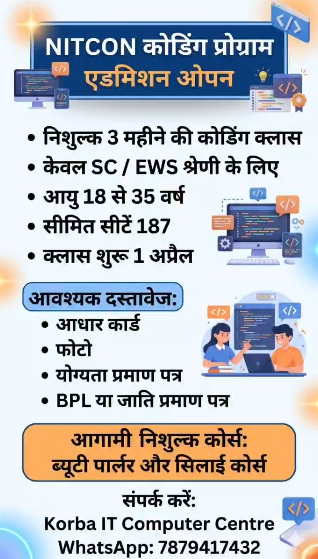 **कोरबा।** युवाओं को तकनीकी शिक्षा और रोजगार के अवसर प्रदान करने के उद्देश्य से **NITCON कोडिंग प्रोग्राम** के तहत 3 महीने की निशुल्क कोडिंग क्लास के लिए एडमिशन शुरू कर दिए गए हैं। यह कार्यक्रम विशेष रूप से **SC और EWS श्रेणी** के युवाओं के लिए आयोजित किया जा रहा है।
