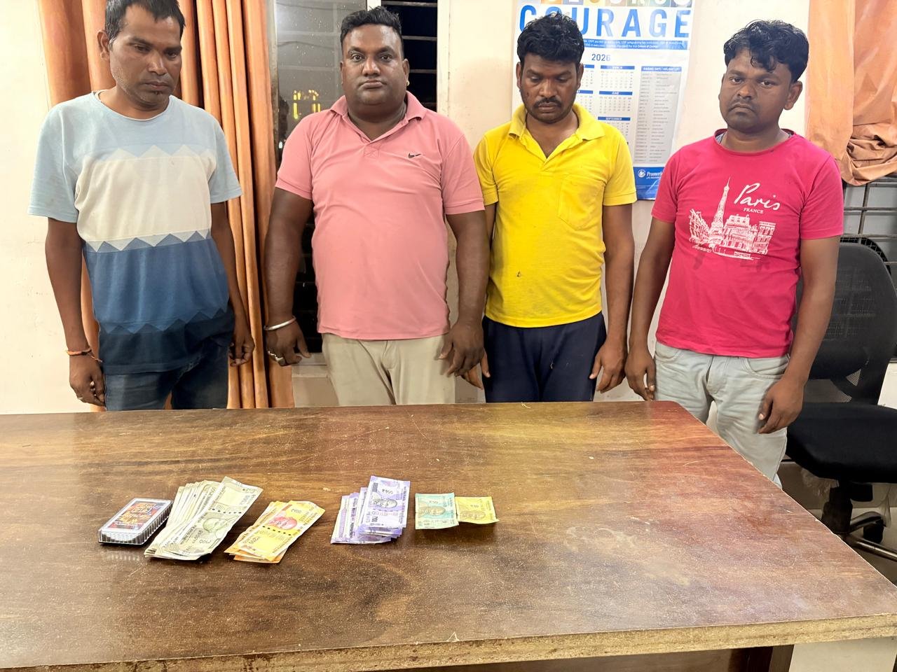 सूचना पर तत्काल पुलिस टीम द्वारा गवाह भरत उरांव एवं दिव्य साहू को साथ लेकर मौके पर रेड कार्यवाही की गई। पुलिस टीम को देखकर कुछ जुआरी अंधेरे का फायदा उठाकर मौके से फरार हो गए, वहीं चार आरोपियों को मौके पर जुआ खेलते हुए रंगे हाथ पकड़ा गया।